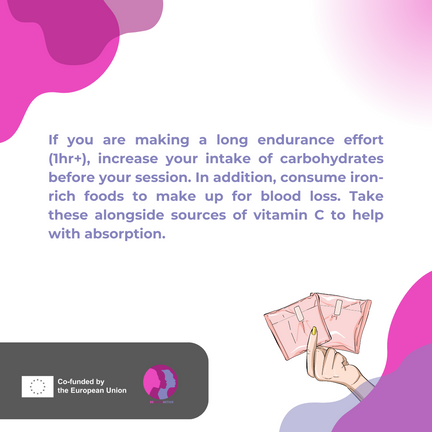 👉If you are making a long endurance effort (1hr+), increase your intake of carbohydrates before your session. In addition, consume iron-rich foods to make up for blood loss. Take these alongside sources of vitamin C to help with absorption.